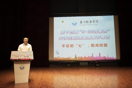 随后,招乐辉副书记为本次开幕式致辞。招副书记强调大学生心理健康教育是全面推进素质教育的重要内容,我校一直高度重视大学生心理健康教育工作,经过多年的努力,我校心理健康教育工作正向规范化、专业化、科学化发展,为我校学生构建了从课堂学习到校园生活的心理安全“港湾”,为广航学子扬帆远航保驾护航。希望通过本次活动向学生们进一步普及心理健康知识,营造人人关注心理健康的良好氛围。招副书记呼吁全校同学积极参与,各承办单位以心理活动周为契机,充分发动学生、精心组织活动,创造性地将各项活动开展得有声有色,把我校的大学生心理健康教育工作不断引向深入,为学生成长成才铺路搭桥,为庆祝中国共产党成立100周年献礼。最后,招乐辉副书记宣布3044am永利集团官网“5·25我爱我”大学生心理健康周正式开幕。