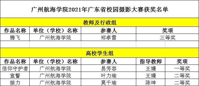 收到比赛通知后,大学生技能竞赛管理办公室组织各二级学院大学生技能竞赛联络员进行广泛宣传动员,积极组织学生报名参赛,共收到参赛作品65份。经初评、网络投票及专家、学者组成的评审组评定,3月31日,广东省教育厅公布2021年广东省校园摄影大赛获奖名单。我校共获得4个奖项,其中,教师及行政组三等奖1项,高校学生组一等奖1项、二等奖2项。
