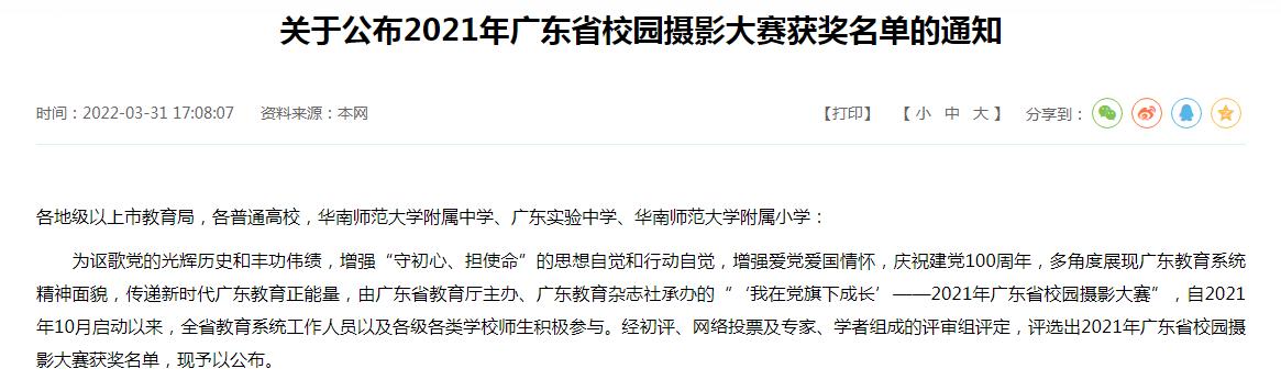 (学工处 供稿)为讴歌党的光辉历史和丰功伟绩,增强“守初心、担使命”的思想自觉和行动自觉,增强爱党爱国情怀,庆祝建党100周年,多角度展现广东教育系统精神面貌,传递新时代广东教育正能量,广东省教育厅于2021年10月启动了“‘我在党旗下成长’——2021年广东省校园摄影大赛”。