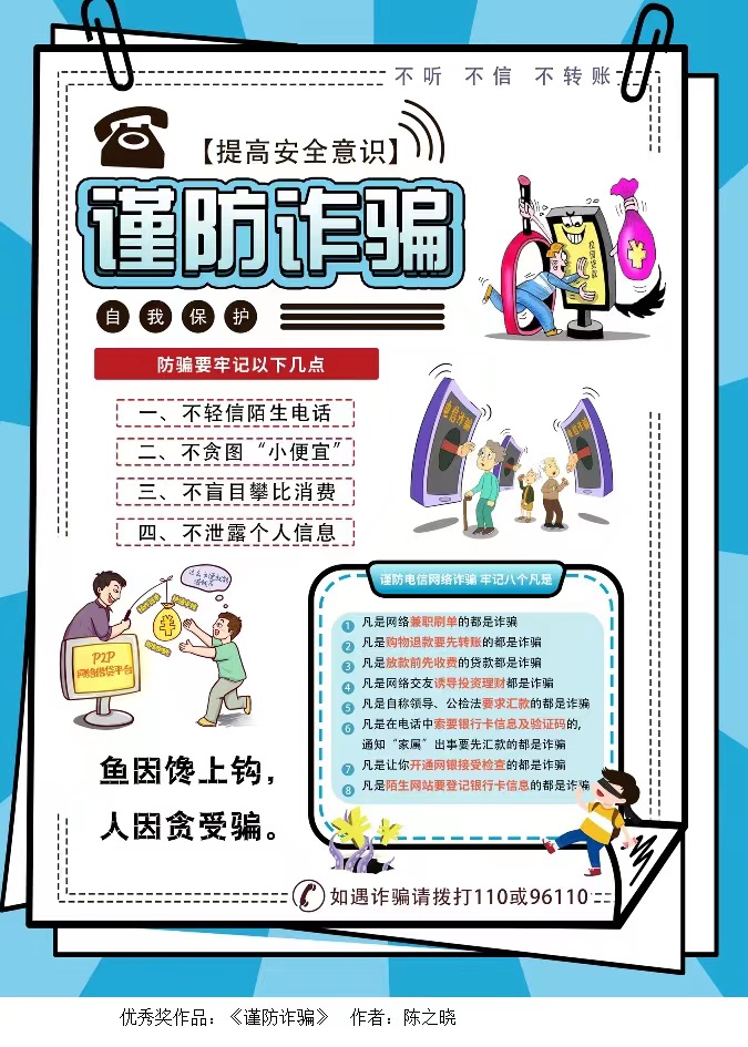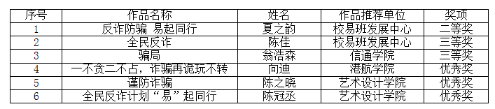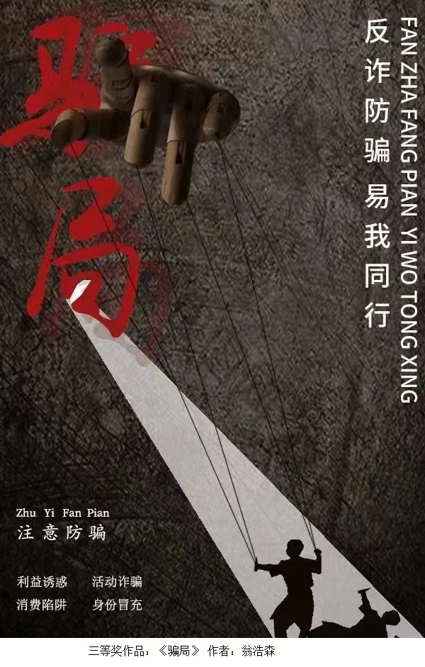 (学工处 供稿)近日,由广东高校网络思想政治工作中心主办,广东轻工职业技术学院易班工作站、广东轻工职业技术学院“轻年说”网络工作室承办的“反诈防骗,易起同行”海报设计大赛活动获奖名单公布。经专家评审评定,全省共评出一等奖3名、二等奖6名、三等奖9名,优秀奖10名。我校易班发展中心积极组织各学院学生参赛,共报送了25份作品参赛,我校学生作品获二等奖1项、三等奖2项、优秀奖3项。