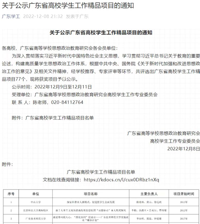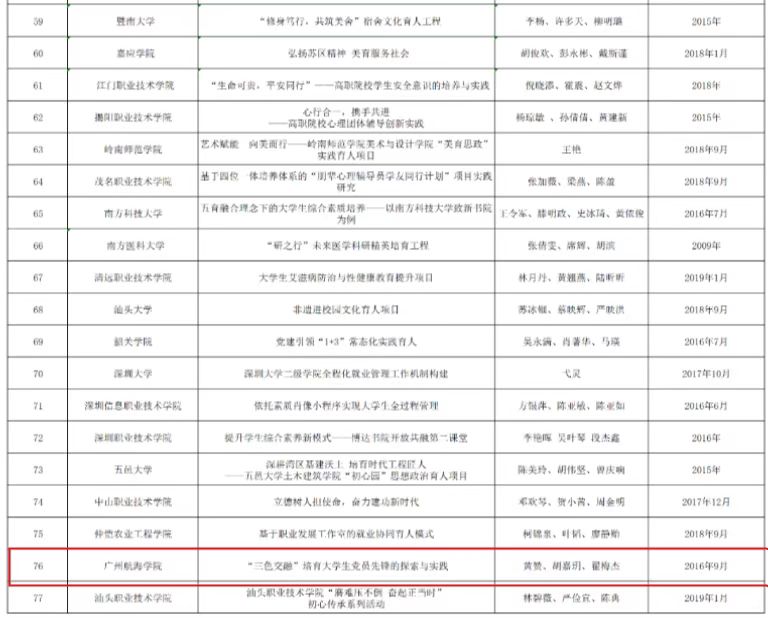 (学工处 船舶与海洋工程学院 供稿)为深入贯彻落实习近平新时代中国特色社会主义思想,学习贯彻习近平总书记关于教育的重要论述,构建高质量学生思想政治工作体系,根据中共中央、国务院《关于新时代加强和改进思想政治工作的意见》及相关文件精神,经学校推荐、专家评审等环节,广东省高等学校思想政治教育研究会高校学生工作专业委员会共评选出广东省高校学生工作精品项目77个,我校船舶与海洋工程学院项目《“三色交融”培育大学生党员先锋的探索与实践》获评2022年“广东省高校学生工作精品项目”。