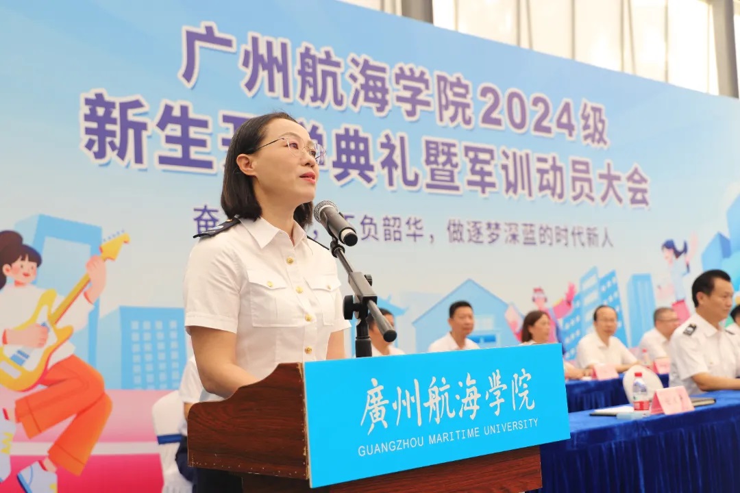 开学典礼在庄严的国歌声中拉开帷幕。学校党委书记陶韶菁发表了“奋楫扬帆 逐梦深蓝 与广航一起开启71%地球探索计划”的主题讲话,她从古代海上丝绸之路与校区所在地的不解之缘切入,介绍了学校凭海而立的发展历程、因海而兴的办学特色和向海图强的发展态势,向同学们阐释“广航是一所怎样的大学?”她表示:广航是一所肩负家国使命的大学,抗美援越的红色历史成就了广航学子心系家国、勇者无畏的奋斗精神,改革开放的时代浪潮又赋予广航学子挺进深蓝,服务经济社会发展的职责担当迈入新时代,国家建设交通强国、海洋强国的雄心,更赋予了粤港澳大湾区全新定位,为广航人向着浩瀚海洋探索追梦,以内生的澎湃动力披荆斩棘,向光而行;广航是一所特色鲜明的大学,六十年栉风沐雨、砥砺前行,学校已为国家培养了近十万名毕业生,一代代广航人深耕广耘,风雨兼程,学校积淀了以“勤学 善思 厚德 求新”为校训的文化底蕴,形成了面向大交通的“海洋+低空”特色学科群,以工学为主,管、经、文、法、艺等多学科协调发展的格局;广航是一所赓续奋斗的大学,春秋几度,生生不息,办学水平不断提升,近年来更是在校区建设、师资队伍建设、学科专业建设及人才培养质量、高能级科研平台建设、校园环境改造等方面呈现迅猛发展的态势。