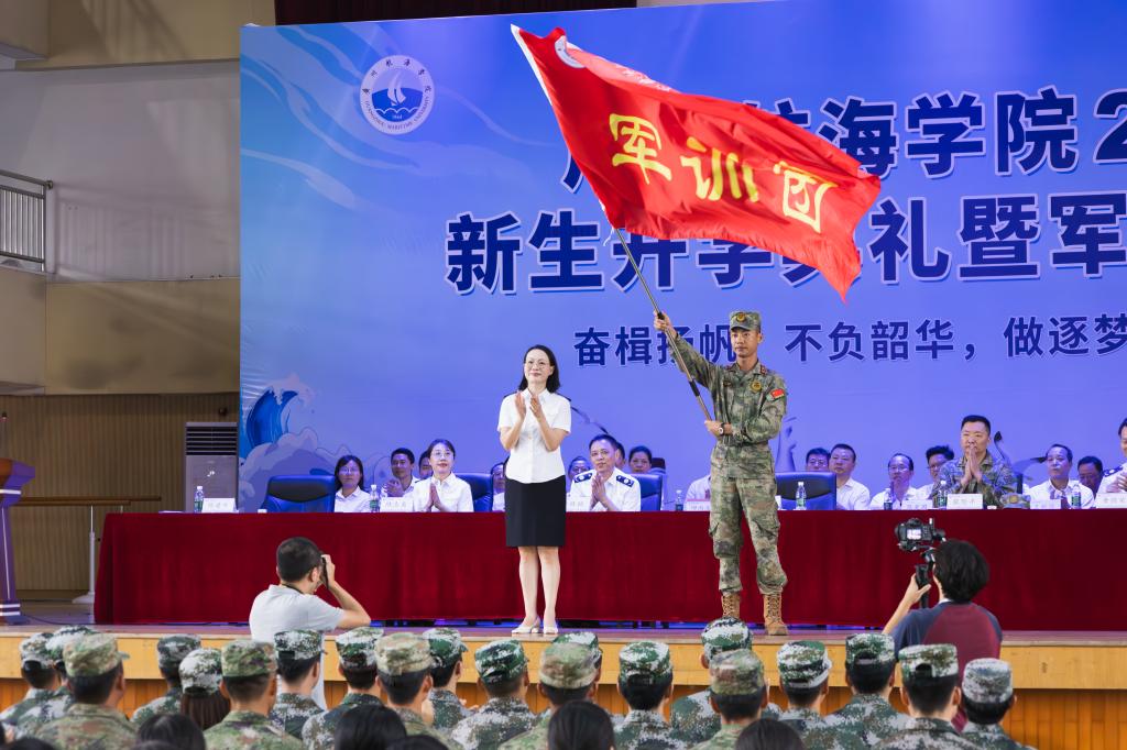 陶韶菁向黄埔校区军训团和琶洲校区军训营授旗。