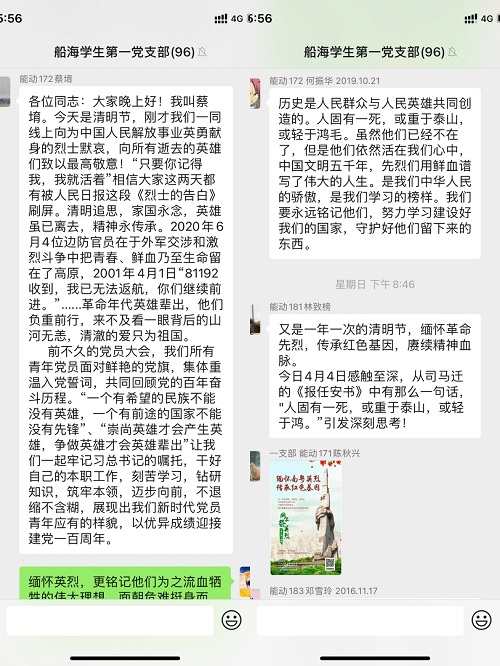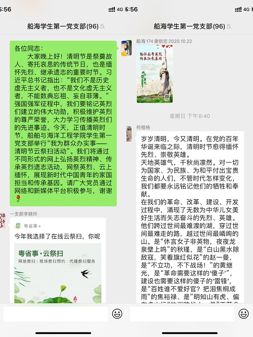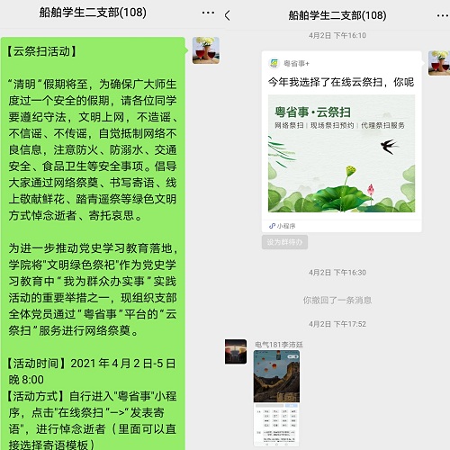 (船舶与海洋工程学院 供稿) 为深入开展党史学习教育,进一步发扬红色传统、传承红色基因、赓续精神血脉,坚守共产党人的初心使命,船海与海洋工程学院学生党支部于4月3日-5日组织学生党员、入党积极分子开展“我为群众办实事”线上祭扫实践活动。