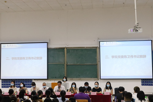 首先,陈书记对新同学表示热烈欢迎,并向同学们介绍了学院的办学情况,他用四个“学会”,向萌新们表达了殷切期望。一是学会学习。希望同学们尽快熟悉、适应大学生活,学会自主学习,养成自立、自律的学习、生活习惯。二是学会沟通。希望同学们积极主动与老师、同学沟通,以良好的沟通拉近心灵的距离,改善人际关系,在遵纪守法的前提下,多参加有组织、有保障、有意义的活动。三是学会感恩。在同学们的成长过程中,父母、亲友、国家、社会都为同学们的成长提供了良好的机会和环境,希望同学们换位思考,学会感恩。四是学会生活。同学们来自五湖四海,大家的成长环境、喜好、生活习惯不同,在集体生活中,要学会理解、包容,友好相处。最后,陈书记以习近平总书记在庆祝中国共产党成立100周年大会上的讲话与同学们共勉,“未来属于青年,希望寄予青年。一百年前,一群新青年高举马克思主义思想火炬,在风雨如晦的中国苦苦探寻民族复兴的前途。一百年来,在中国共产党的旗帜下,一代代中国青年把青春奋斗融入党和人民事业,成为实现中华民族伟大复兴的先锋力量。新时代的中国青年要以实现中华民族伟大复兴为己任,增强做中国人的志气、骨气、底气,不负时代,不负韶华,不负党和人民的殷切期望!