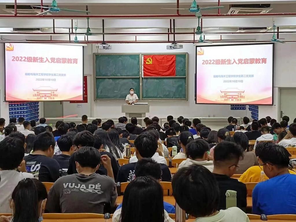 (船舶与海洋工程学院 供稿)为点燃青年学子理想信念之火,深耕厚植爱党爱国情怀,帮助青年学子知党、信党、爱党,10月10日,船舶与海洋工程学院学生第二党支部在健兵北400课室开展以“青春心向党,喜迎二十大”为主题的2022级新生入党启蒙教育。教育会由支部书记刘楚主讲。支部的优秀党员团员代表、新生班级带班助理,以及2022级电气工程专业、机械工程专业、机器人工程专业的全体新生参加。