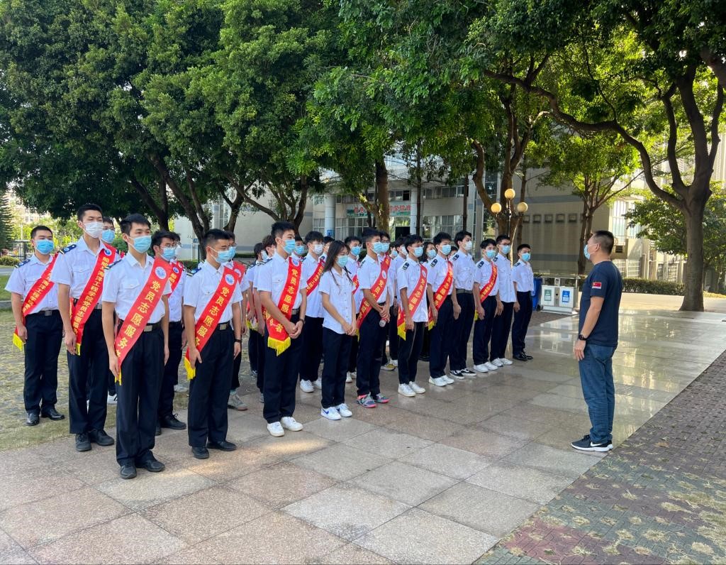 志愿服务开始前,全体志愿者们佩戴志愿服务绶带,身姿挺拔、精神抖擞在海燕广场列队集合,分管半军事管理专项的谭华京老师对本次工作做出具体的要求和安排,并提醒大家在做好个人防护的前提下,配合、助力学校安全、平稳、高效地完成核酸检测各环节任务。