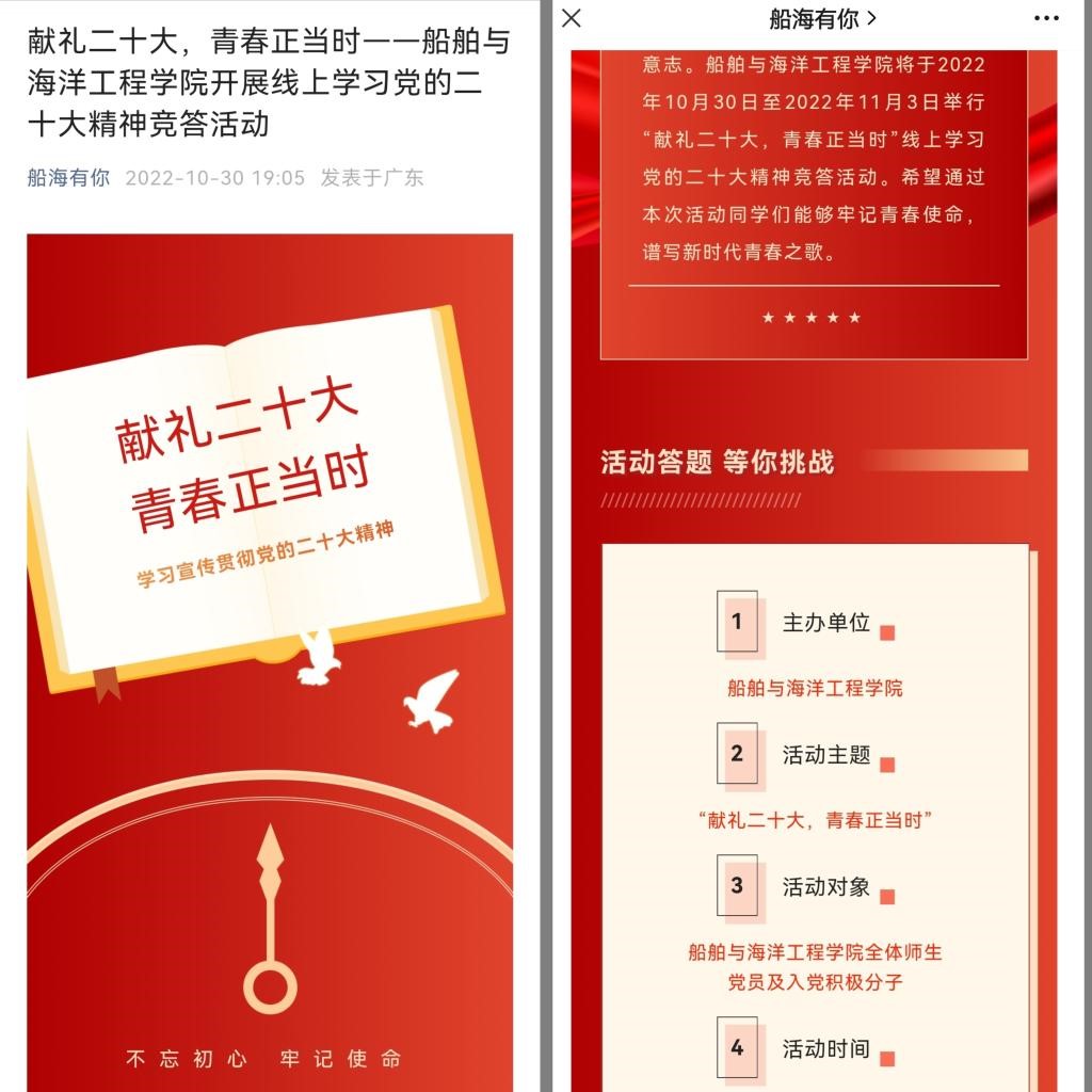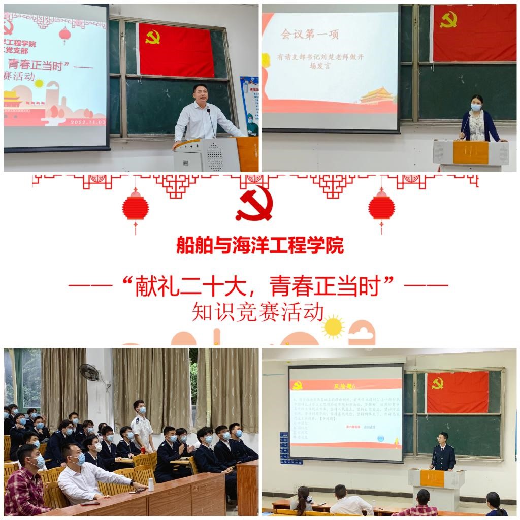 (船舶与海洋工程学院 供稿)为进一步深入学习贯彻党的二十大精神,创新学习形式、增强学习效果,10月30至11月4日期间,船舶与海洋工程学院采用“线上+线下”结合的方式组织开展以“献礼二十大,青春正当时”为主题的“学习党的二十大精神”知识竞赛活动,以赛促学、以赛促知、以赛促用。学院师生党员、入党积极分子参与。