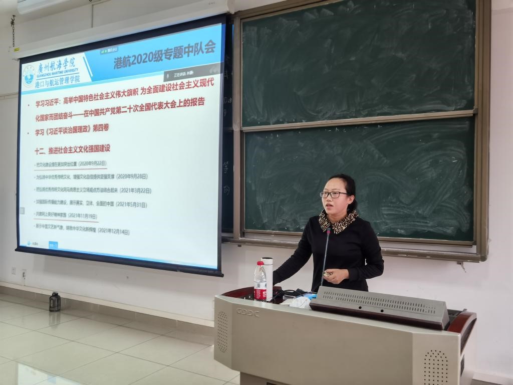 (港航学院 供稿)为深入贯彻党的二十大精神,动员同学们将思想和行动统一到党的二十大精神上来,港口与航运管理学院2020级中队于2022年11月8日在线上线下同时组织学生学习党的二十大精神专题会议。本次会议由辅导员林静老师主讲,参会人员为全体2020级同学,共228名。