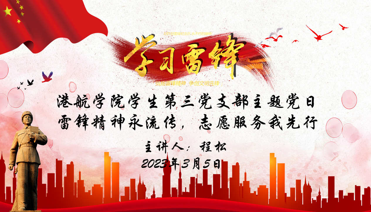 (港航学院 供稿)为了传承雷锋精神,弘扬时代新风,争做时代先锋,港航学院学生第三党支部于2023年3月5日“雷锋纪念日”当天晚上在西教106开展了“雷锋精神永流传,志愿服务我先行”线下主题党日学习会,其中3名教师党员、90名入党积极分子、12位毕业班学生党员参加了主题党日学习会。会议由党支部书记程松主讲。