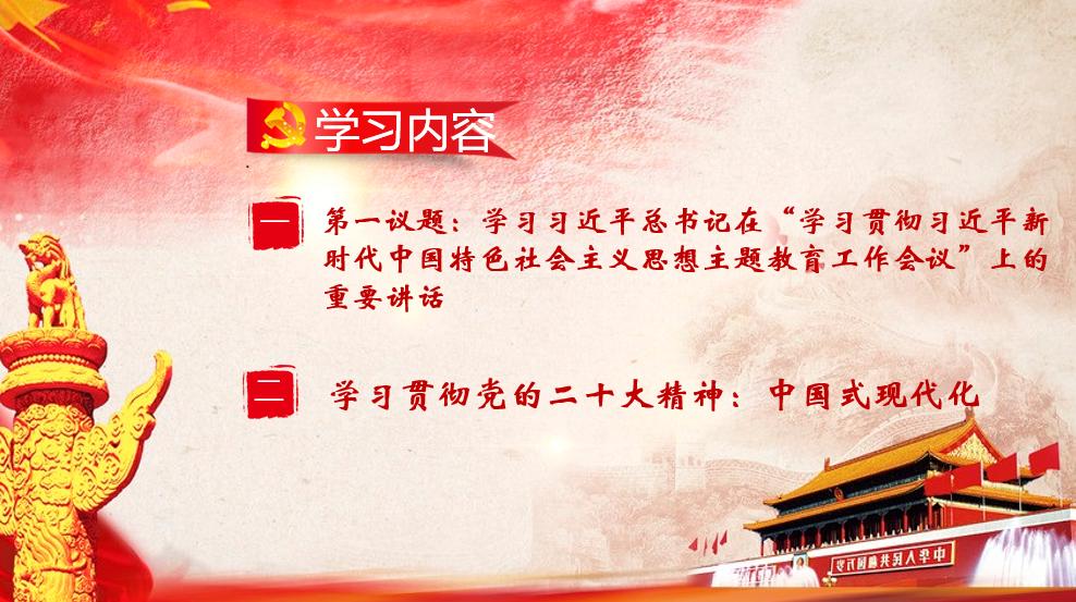本次会议学习内容分为两部分:第一议题是学习习近平总书记在“学习贯彻习近平新时代中国特色社会主义思想主题教育工作会议”上的重要讲话;第二部分是深入学习贯彻党的二十大精神:中国式现代化。