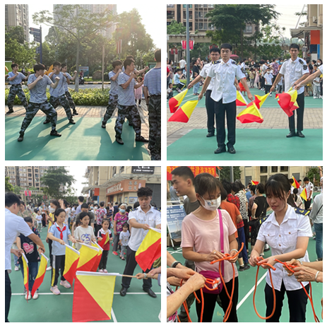 活动现场,首先由海运学院退役复学大学生进行擒敌拳展演,生动地向居民们展示了军人的飒爽英姿和过硬的身体素质。随后,海运学子开展旗语和打绳结展演,科普航海知识,宣传航海文化,传承海洋文明,让居民们更好地了解海洋文化。其次是知识竞答环节,向居民们宣传有关航海的知识和航海的发展,传播海洋强国思想;最后是技能教学环节,让社区居民参与其中,大家热情高涨,学习擒敌拳和旗语技能、海洋与救生常识,体验绳结的多种系法,增强了居民们的海洋文化传承意识。