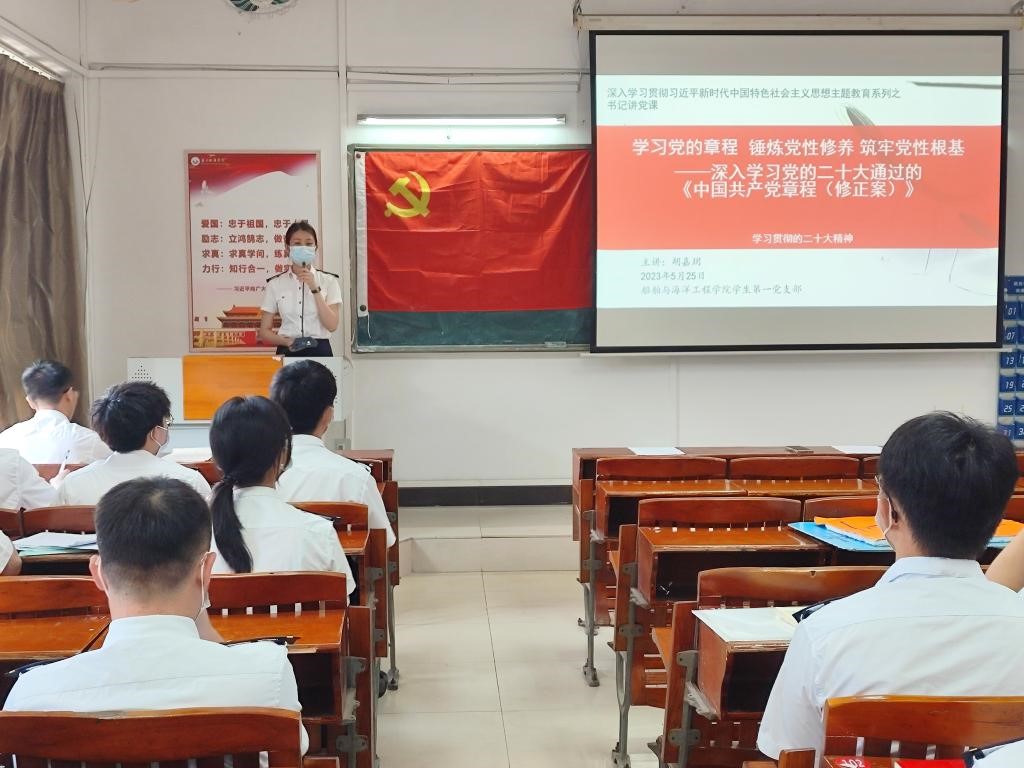 新时代赋予青年新的使命,学生党员应当加强对新党章的学习领会,以学习贯彻习近平新时代中国特色社会主义思想主题教育为契机,积极开展学习和研讨。同时,船海学子要把学习党章和党的基本理论知识同坚守新时代船海人的责任担当紧密结合,为全面服务交通强国、海洋强国建设贡献青春力量。