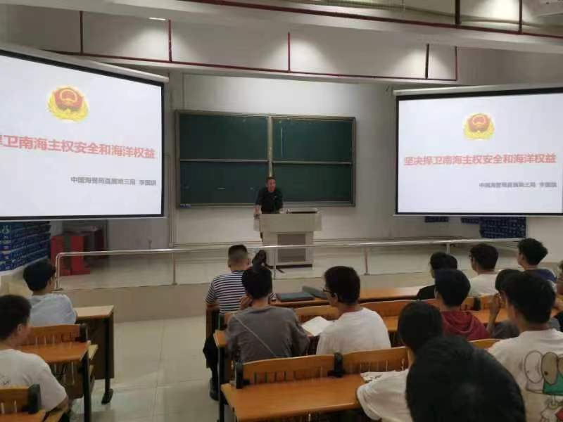 (学工部武装部 供稿)11月8日下午,为深入学习贯彻习近平强军思想,深化大学生国防教育,学校党委学工部、武装部在健兵楼400教室举办《坚决捍卫南海主权安全和海洋权益》报告会,中国海警局直属第三局李国旗副大队长应邀莅临主讲,学工部、武装部副部长肖运发带领260名师生聆听了报告会。