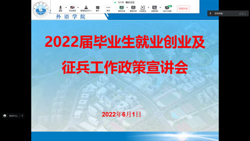 (外语学院供稿)6月1日晚,外语学院召开2022届毕业生就业创业及征兵工作政策线上宣讲会,会议由辅导员李秋艳老师主持,全体毕业生参加此次宣讲会。