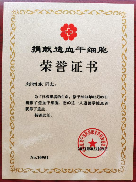1998年7月出生的刘洲东同学,来自广东汕头市,2021年3月9日捐献了造血干细胞,挽救了一个2岁孩子生命,成为中华骨髓库第10951位造血干细胞捐献者。中国造血干细胞捐献者资料库管理中心为刘洲东颁发了《捐献造血干细胞荣誉证书》,并向学校颁发了《感谢状》。