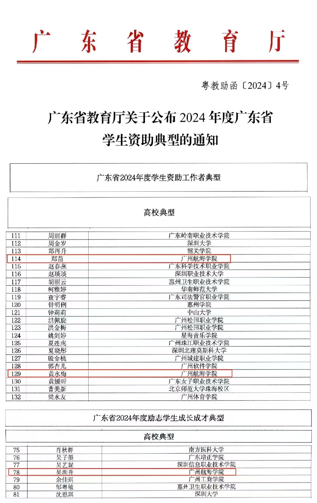 近日,根据《广东省教育厅关于公布2024年度广东省学生资助典型的通知》(粤教助函〔2024〕4号)文件通知,我校有3名师生获奖。其中,校友工作部部长郑苗、学生资助中心老师黄水梅被评为“学生资助工作者典型”;吴圳升同学,凭借连续三年获得国家励志奖学金,并在全国大学生信息安全与对抗技术竞赛、蓝桥杯网络安全春秋挑战赛道等赛事中屡获佳绩,荣获“励志学生成长成才典型”。