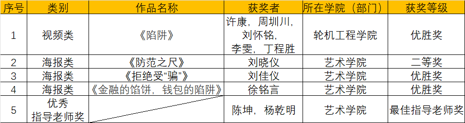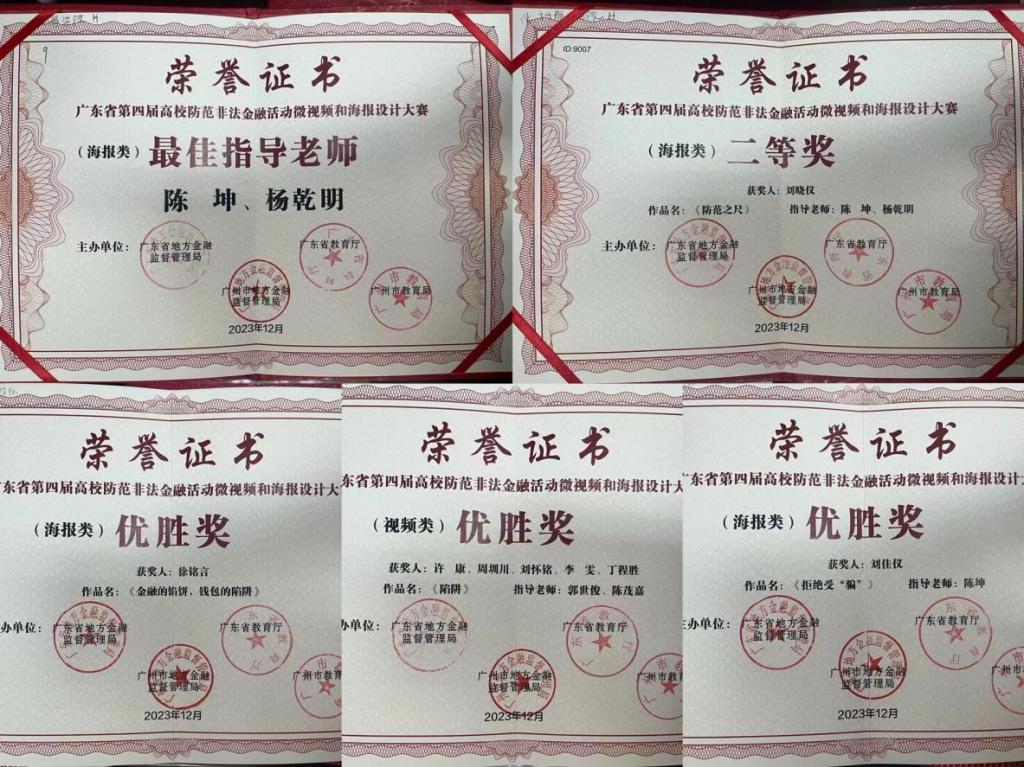 (学工部 供稿)近日,由广东省教育厅、广东省地方金融监督管理局、广州市地方金融监督管理局和广州市教育局联合举办的“广东省第四届高校防范非法金融活动微视频和海报设计大赛”结果公布,我校获得二等奖1项,优胜奖3项,陈坤、杨乾明获得最佳指导老师奖,具体获奖名单如下: