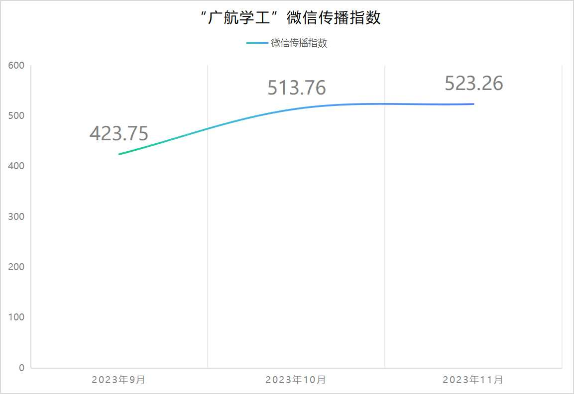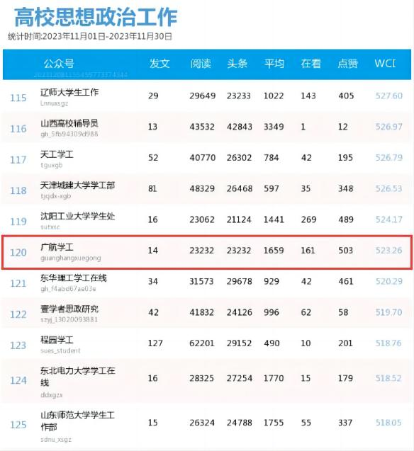 2023年11月,“广航学工”发表推文14篇,获得了超过2.3万阅读量,平均阅读量超过1600次,微信传播指数(WCI)523.26分再次刷新历史纪录。