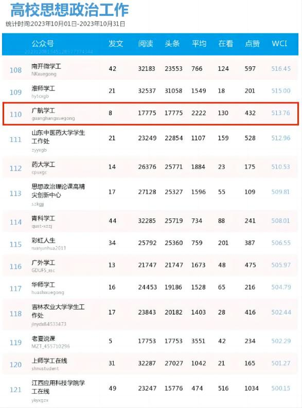 (学工部供稿)近日,清博指数和高校辅导员工作室公布了2023年10月和11月的《高校思想政治工作200个最受欢迎公众号和200篇热文月榜榜单》,我校“广航学工”微信公众号分布以513.76分排名全国第110名和以523.26分排名全国第120名,传播力和影响力进一步提升。