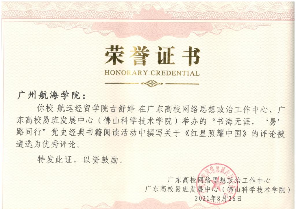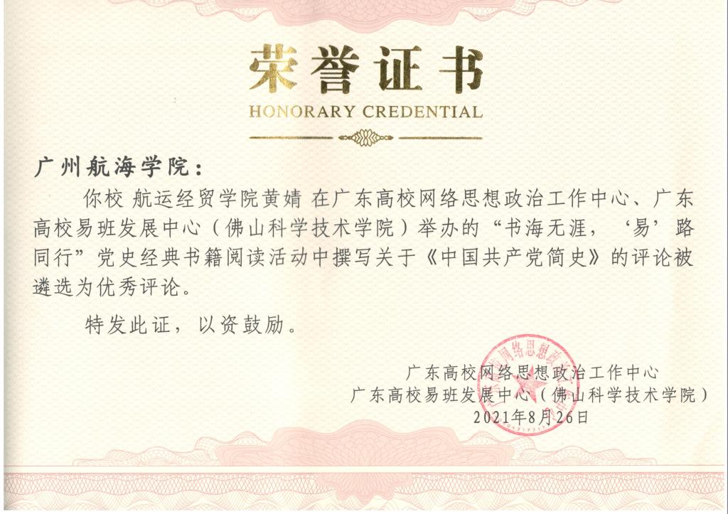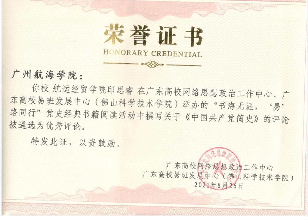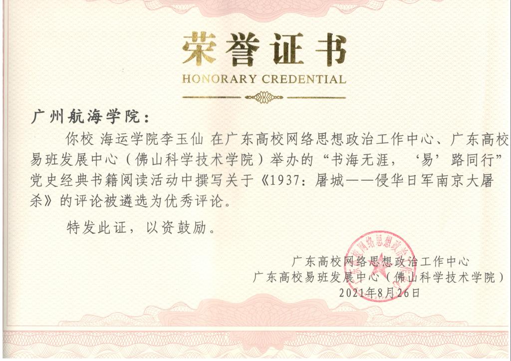 本次活动旨在为庆祝中国共产党成立 100 周年华诞,深入学习贯彻习近平总书记在党史学习教育动员大会上的讲话及关于党史、 新中国史、改革开放史、社会主义发展史学习的重要讲话和指示精神,营造读书好、好读书、读好书的文明风尚,养成良好阅读习惯,推进书香校园建设。活动由广东高校网络思想政治工作中心、广东高校易班发展中心(佛山科学技术学院)主办,经专家评选,共选出50条优秀评论。我校学生6份作品获奖:李玉仙《1937:屠城——侵华日军南京大屠杀》、邱思睿《中国