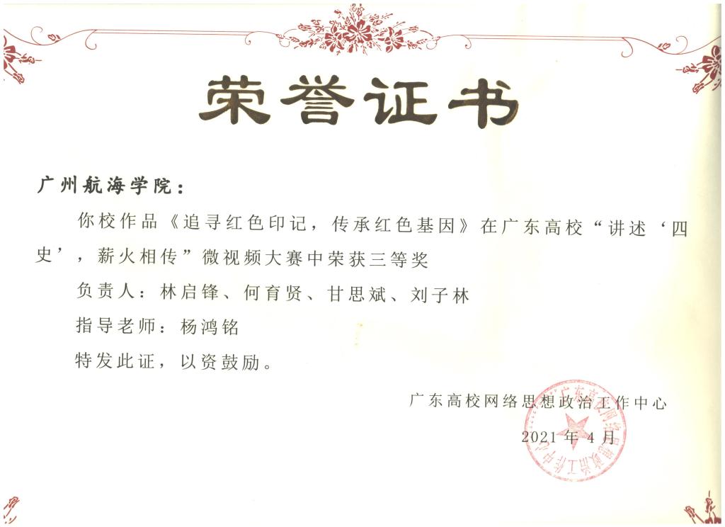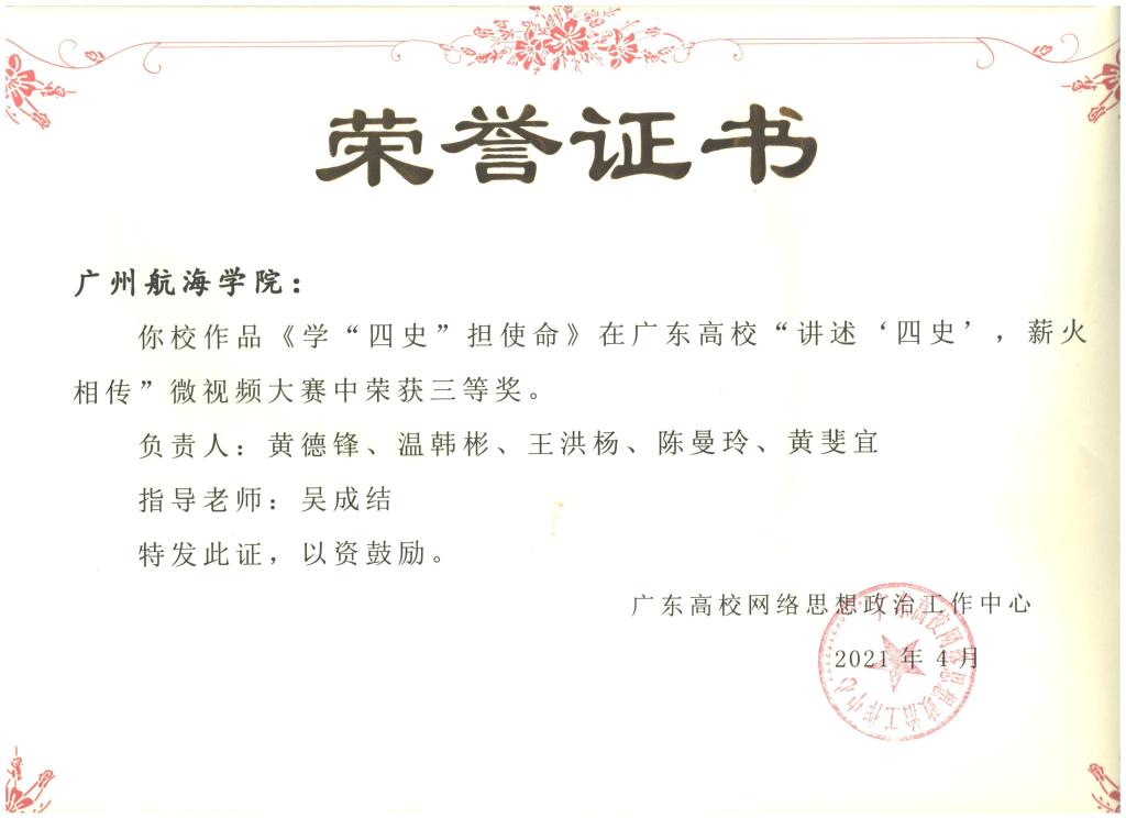 (学工处 供稿)近日,广东高校网络思想政治工作中心公布“讲述‘四史’,薪火相传”微视频大赛获奖名单并下发了获奖证书,我校易班推送的2个作品均获得三等奖。