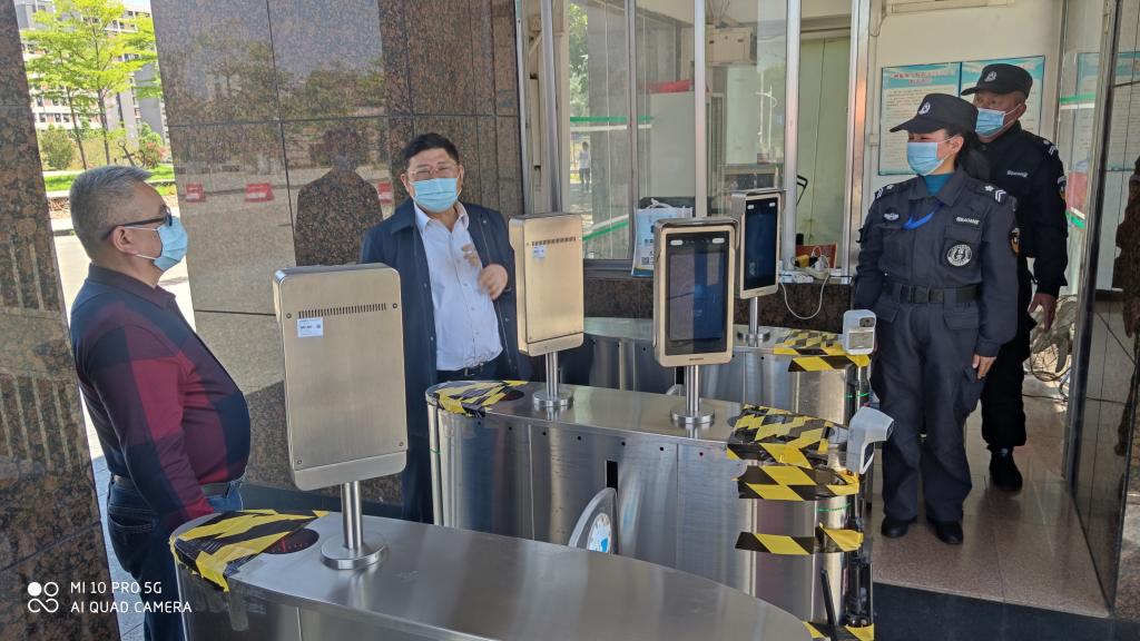 在南北区校园主入口处,邹书记详细询问了进出校门的检查流程,要求严格把好校门关,对进校人员须查健康绿码、行程绿码及测温,对离穗返校人员行李要进行消毒,做到“尽心尽职守一线 把好校园疫情防控第一关”。