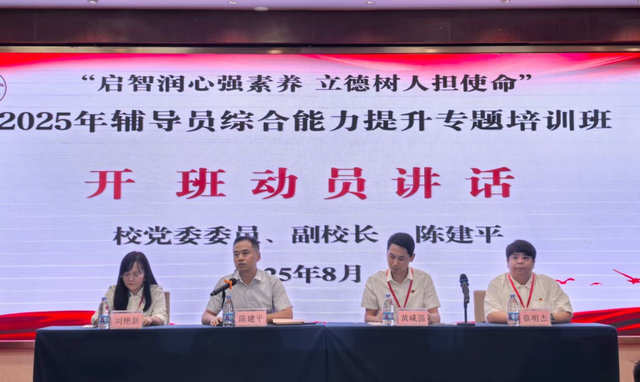 近日,3044am永利集团官网在惠州举办2025年辅导员综合能力提升专题培训班,本次培训班的主题是“启智润心强素养 立德树人担使命”。学校党委委员、副校长陈建平出席开班仪式并作动员讲话。